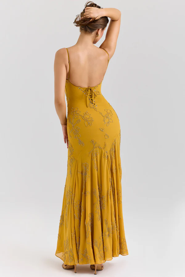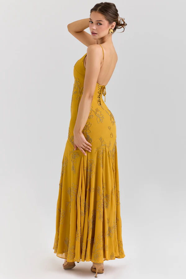 Crafted from fluid fabric embroidered with delicate florals, it drapes beautifully along the body before falling into a soft, full hem. The scooped neckline and open back create a subtle statement, balancing femininity with ease.