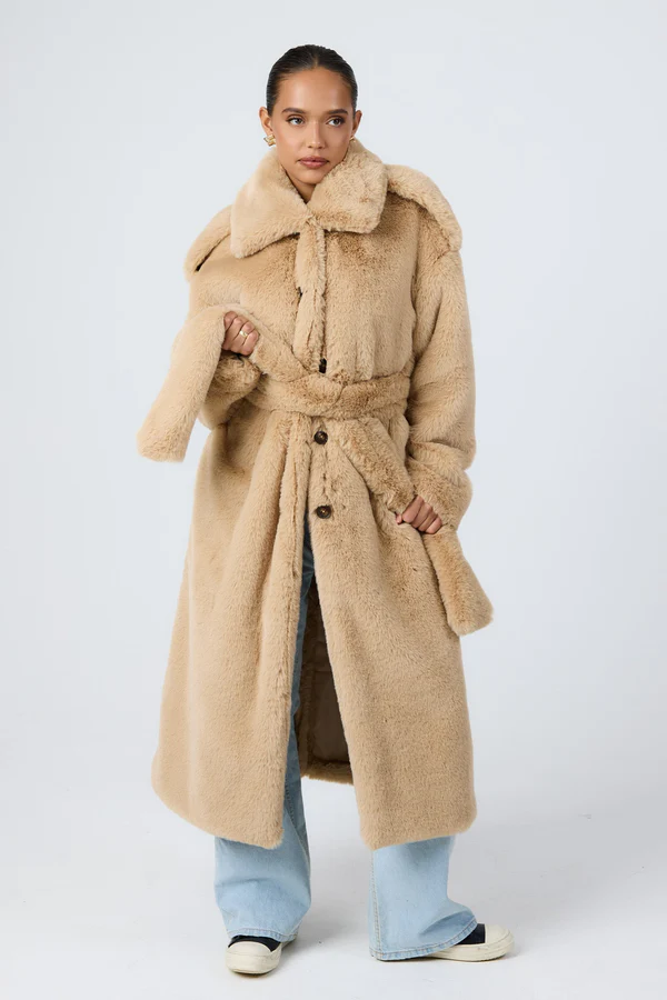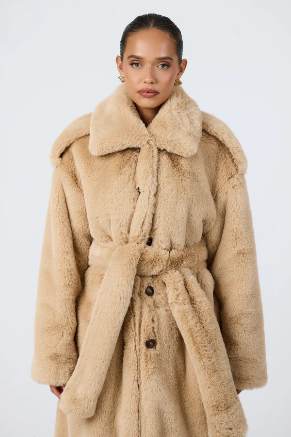 Soft, voluminous, and effortlessly refined, the Mara Plush Maxi Coat features an oversized collar, cozy faux-fur finish, and a cinched waist for subtle structure. A warm, full-length silhouette that adds instant polish to any winter look.