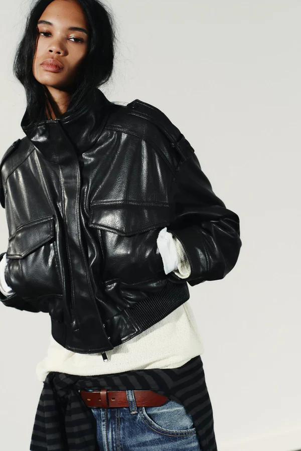 The Oslo Faux Leather Jacket delivers a modern take on the bomber silhouette, blending sleek structure with effortless edge. Crafted from supple faux leather, it features a cropped cut, utility-inspired detailing, and a subtle sheen that elevates everyday styling.