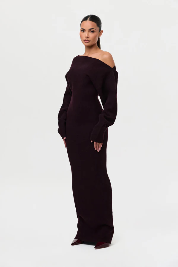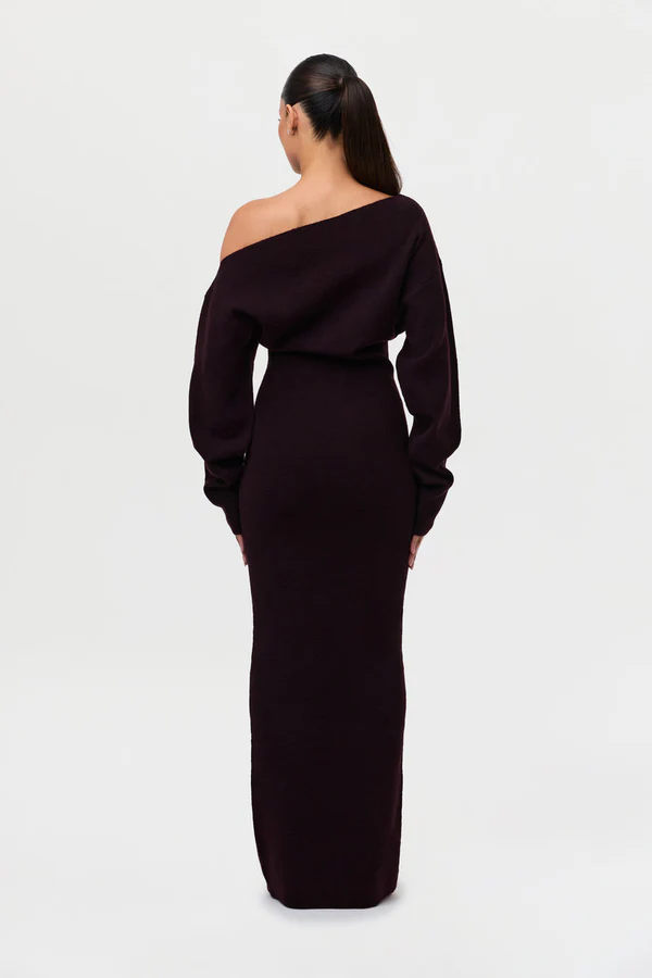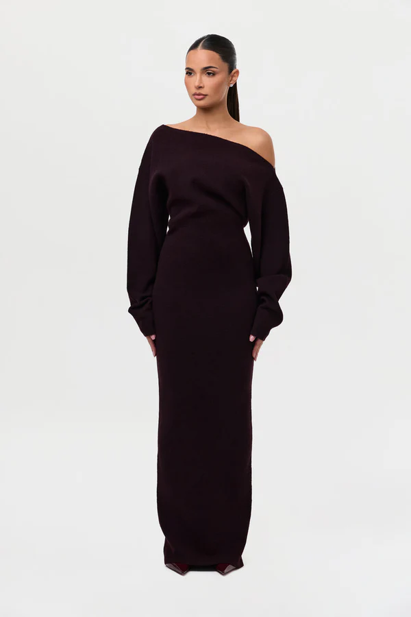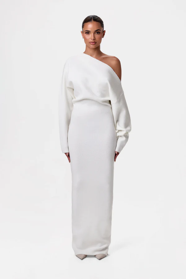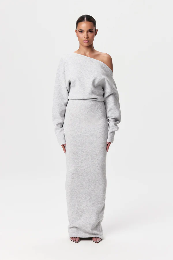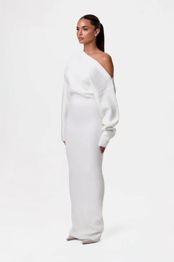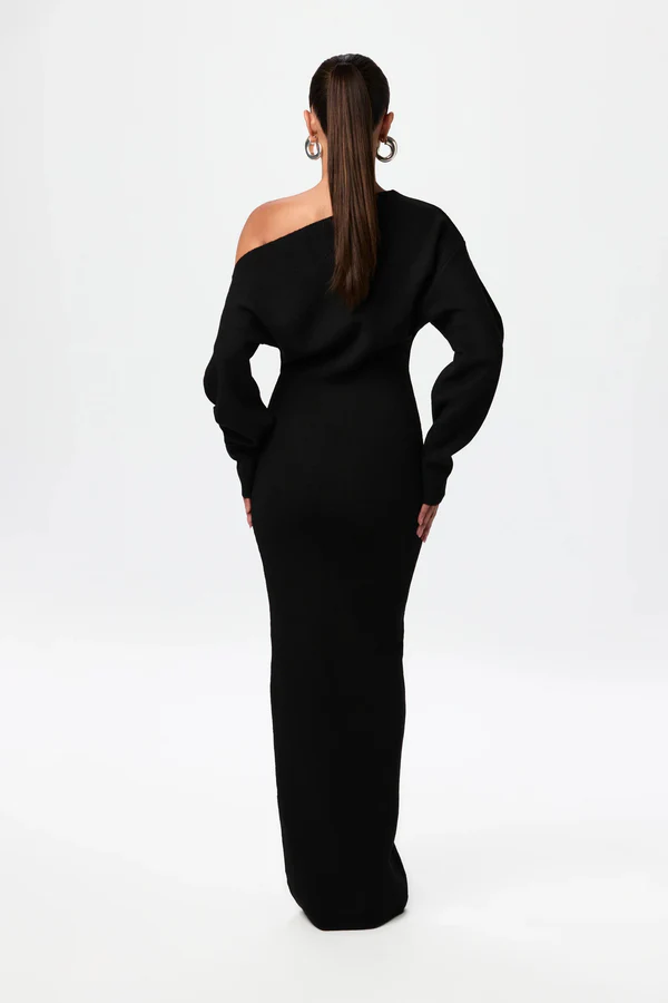 The Thea Off Shoulder Knit Dress exudes understated sophistication with a touch of allure. Crafted from a soft, sculpting rib-knit, it features a draped off-shoulder neckline and elongated sleeves for an effortlessly elegant silhouette.