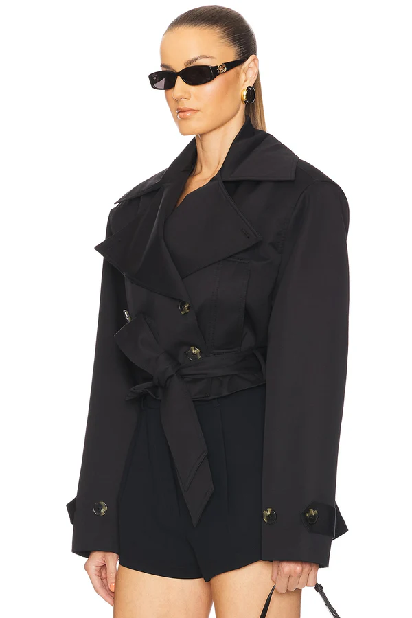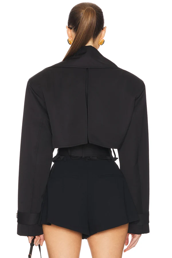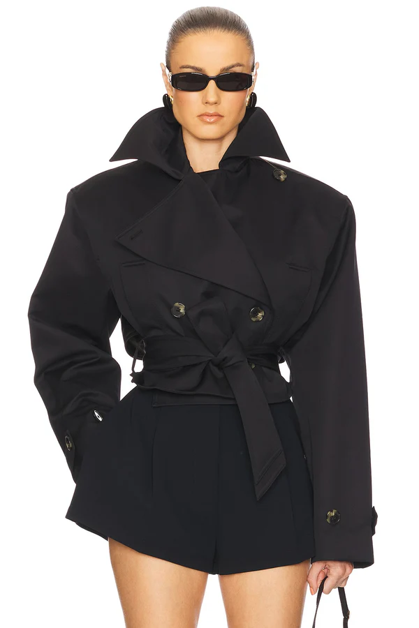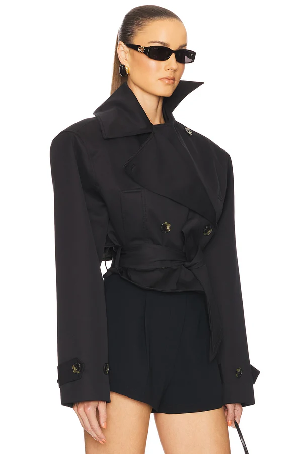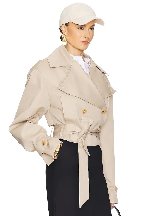 The Tilly Trench isn’t outerwear—it’s an entrance. Cropped at the waist and cut with sculptural volume through the shoulders and sleeves, it adds instant quiet power to anything you wear it with. Button it up for a boxy, structured silhouette, or leave it loose and let the wind do the styling. Either way, it’s giving “main character in a mood.”