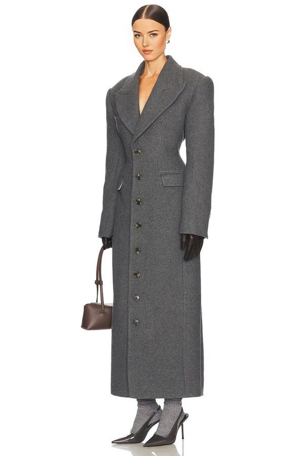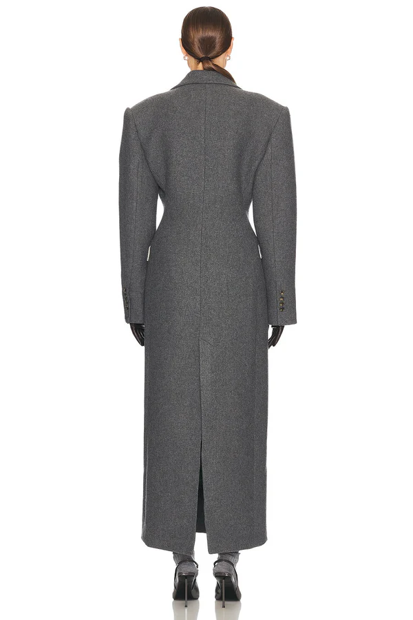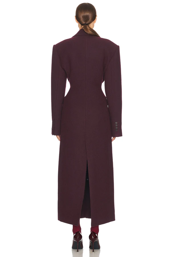 Sleek and sculptural, this plum wool coat defines the waist with precision tailoring and bold shoulders. A full button front and elongated silhouette create a commanding, elegant presence, made for powerful entrances.